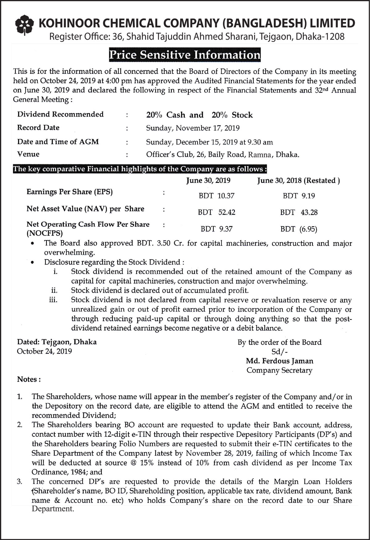 Price Sensitive Information of Kohinoor Chemical Company (Bangladesh) LTD