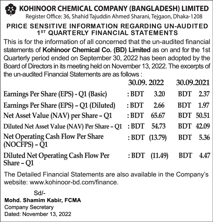 Price Sensitive Information (Q1) of Kohinoor Chemical Company (Bangladesh) Ltd.