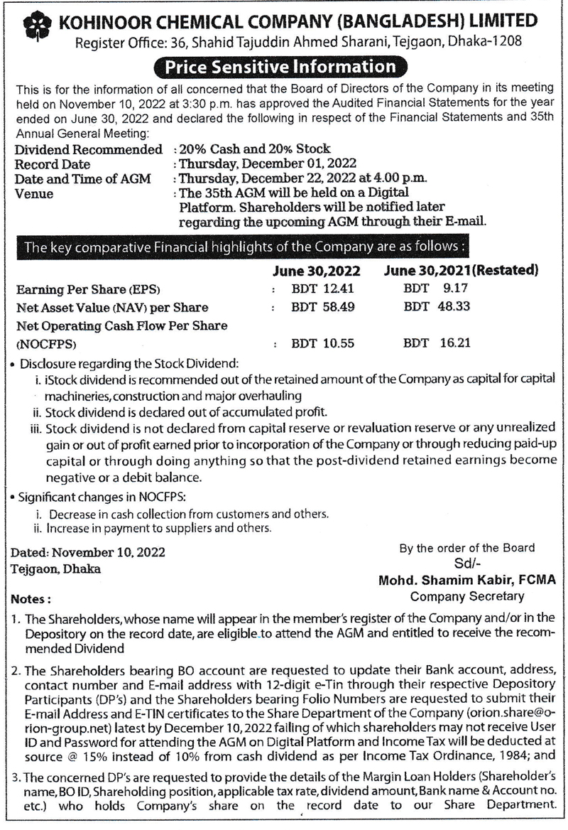Price Sensitive Information of Kohinoor Chemical Company (Bangladesh) Limited