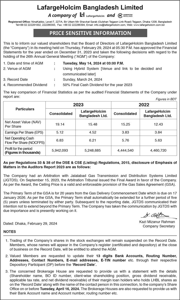 Price Sensitive Information of LafargeHolcim Bangladesh Limited