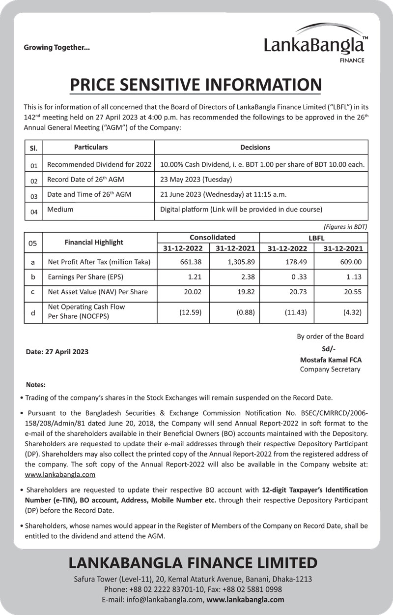 Un-audited Consolidated Financial Statements (Q1) of LankaBangla Finance PLC.