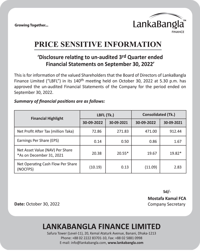 Un-audited Consolidated Financial Statements (Q3) of LankaBangla Finance PLC.