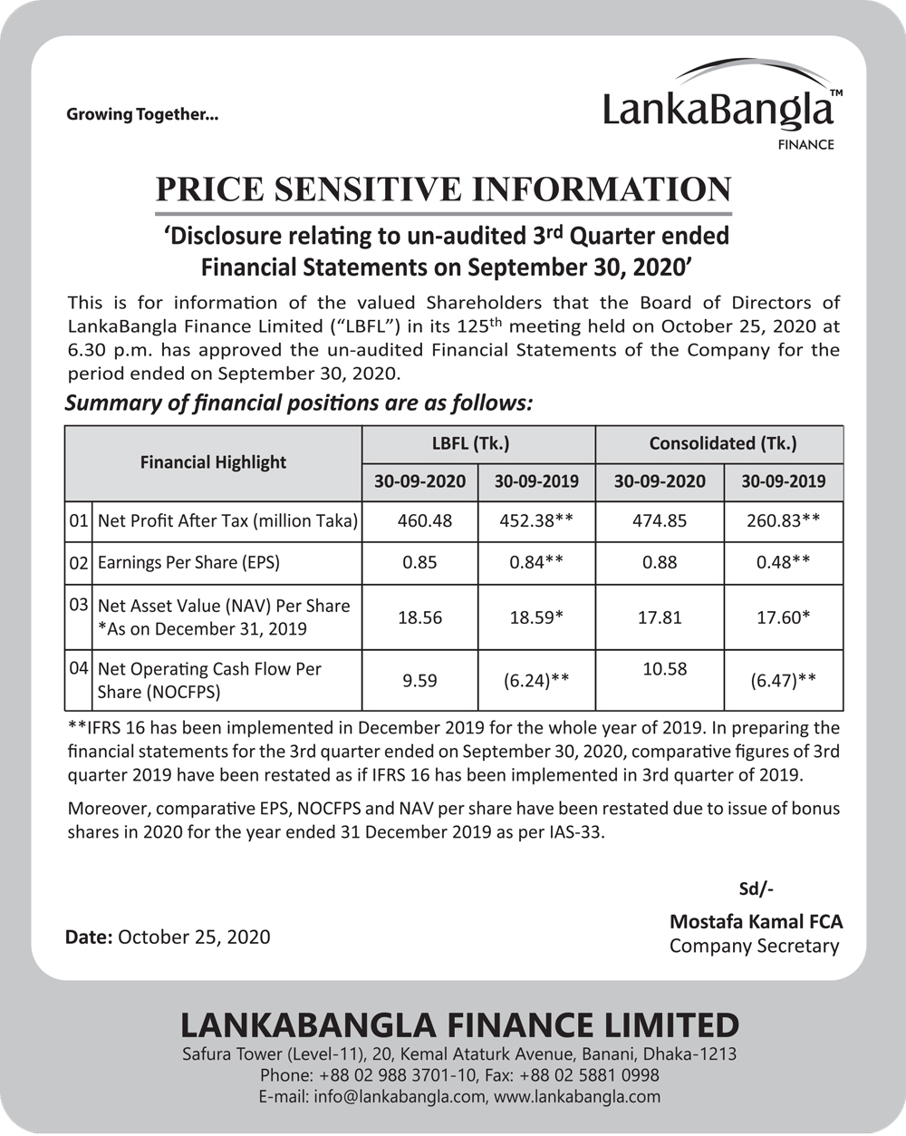 Un-audited Consolidated Financial Statements (Q3) of LankaBangla Finance PLC.