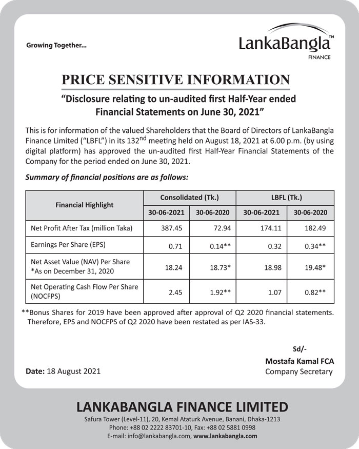 Un-audited Consolidated Financial Statements of LankaBangla Finance PLC.