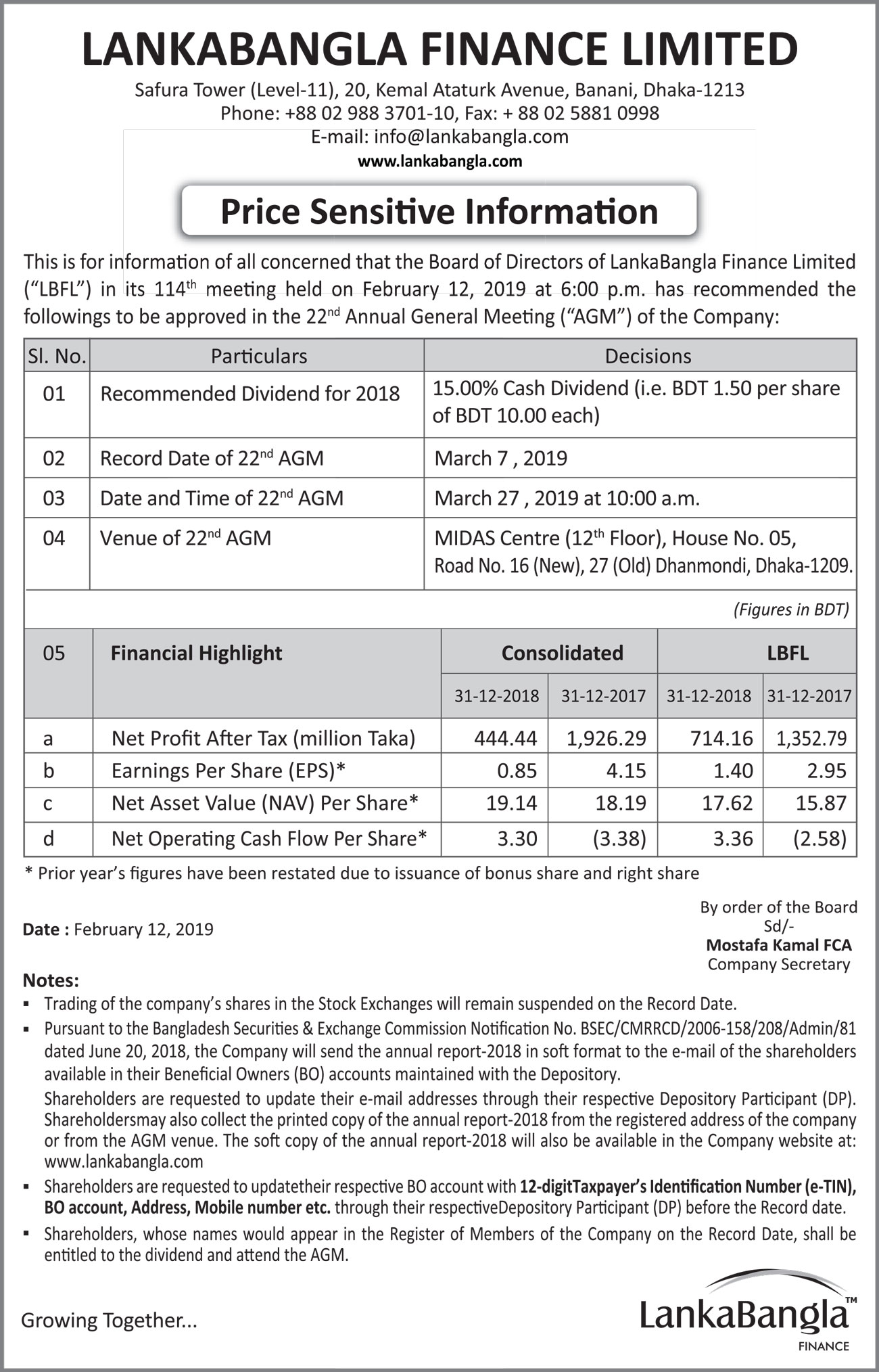 Price Sensitive Information of LankaBangla Finance ltd