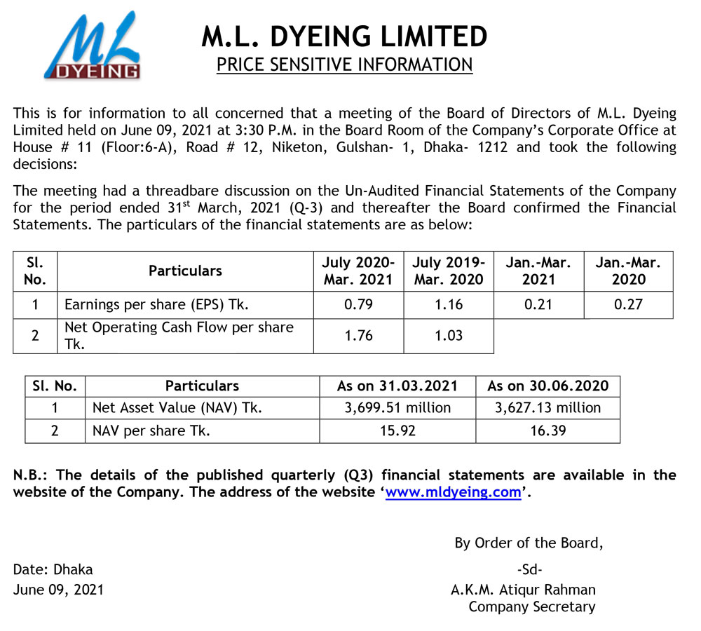 Price Sensitive Information of ML Dyeing & Textile Ind. PLC