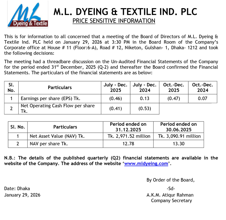 Price Sensitive Information of ML Dyeing & Textile Ind. PLC