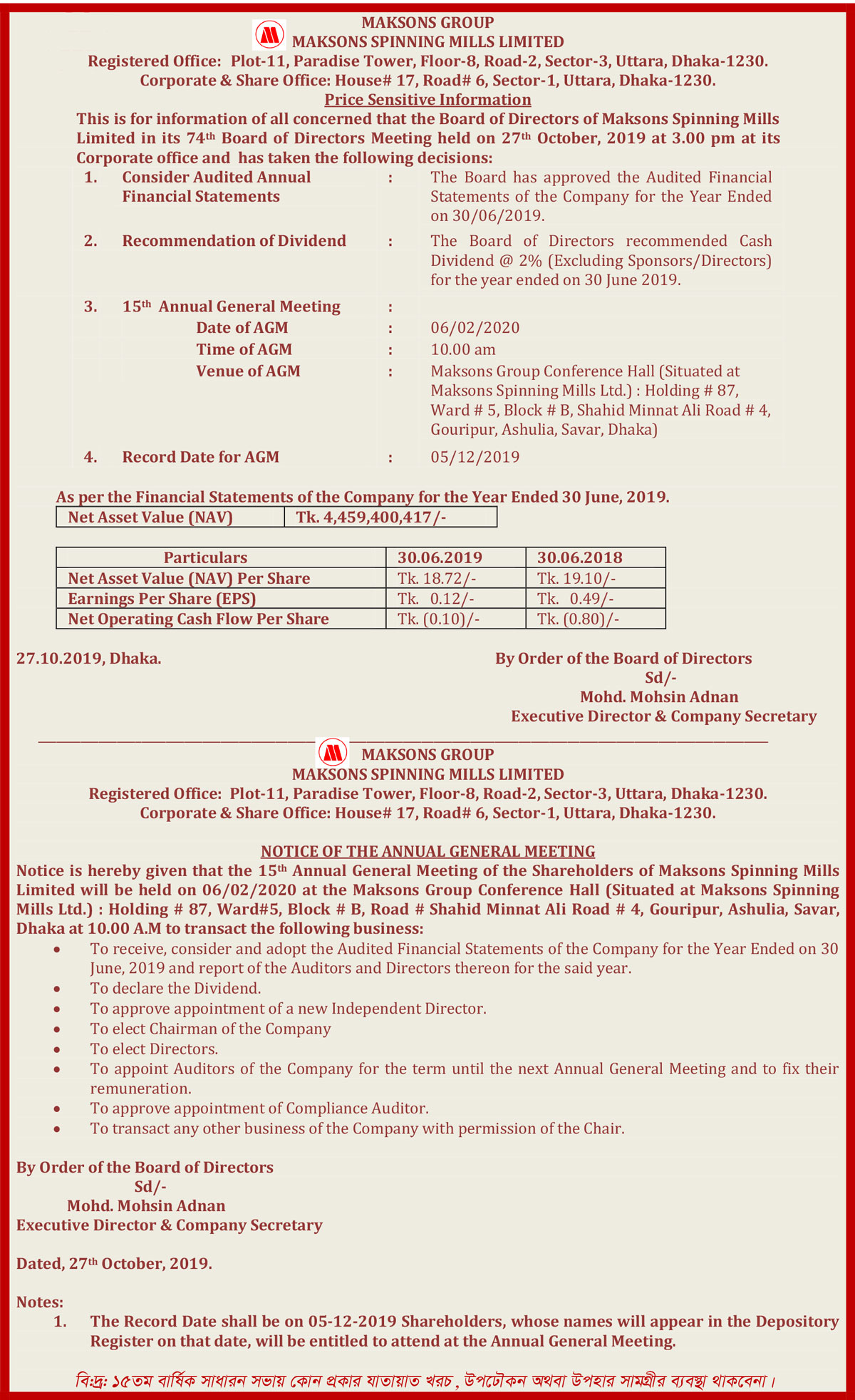 Notice to the Shareholders of Maksons Spinning Mills Limited