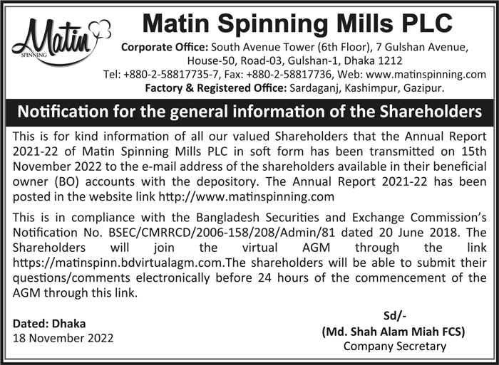 Notification of General Information to the Shareholders of Matin Spinning Mills PLC