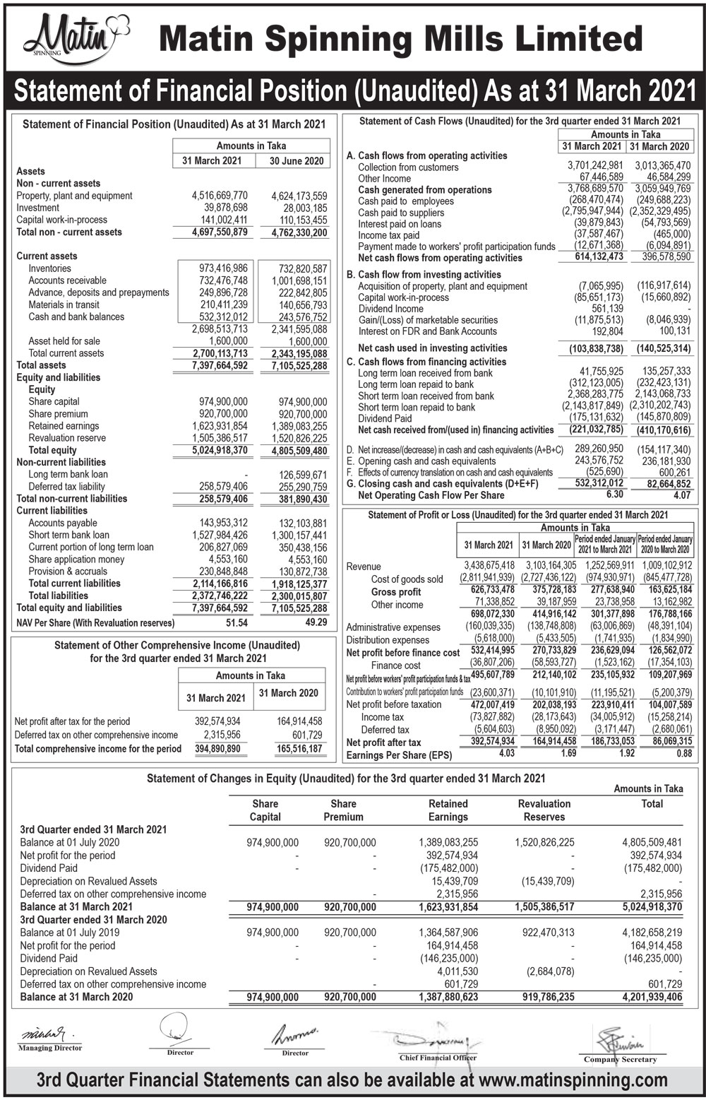 Statements of Financial Position (Unaudited) of Matin Spinning Mills Ltd