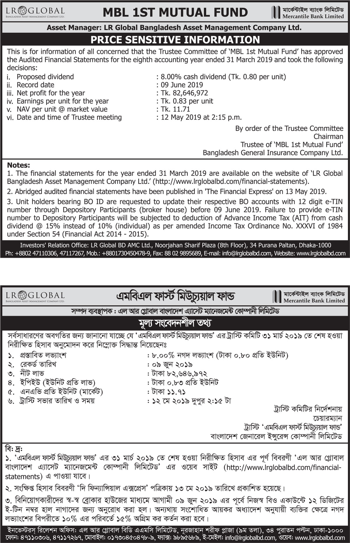 Price Sensitive Information Of MBL 1st Mutual Fund