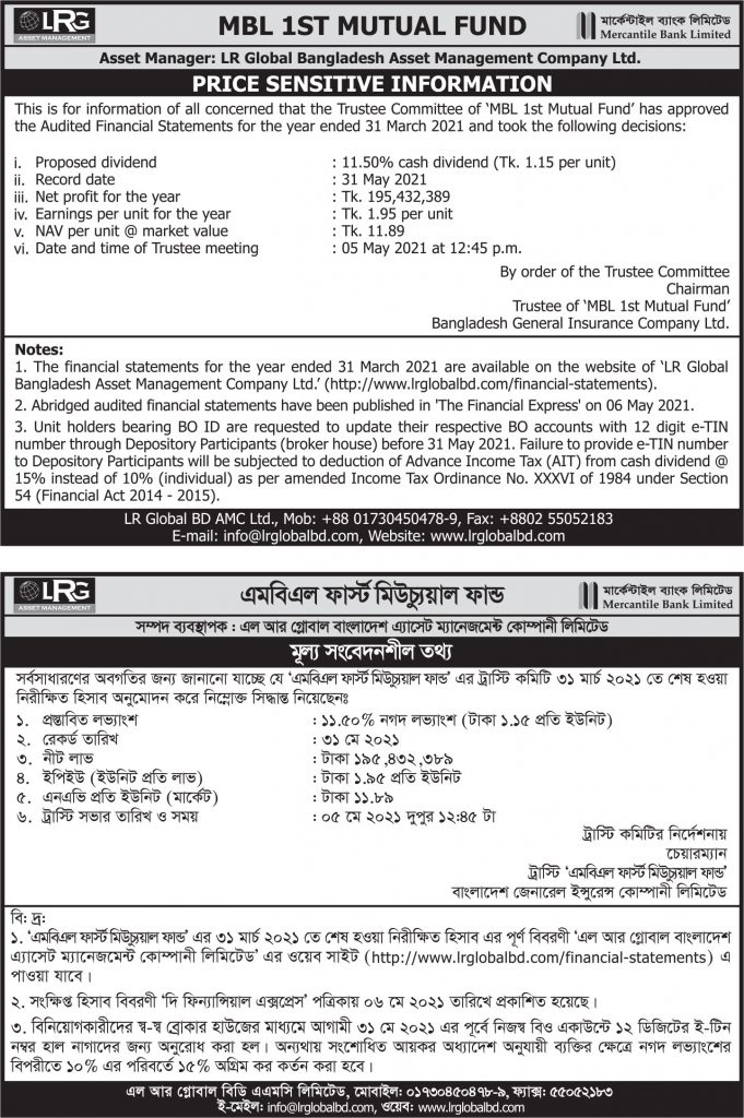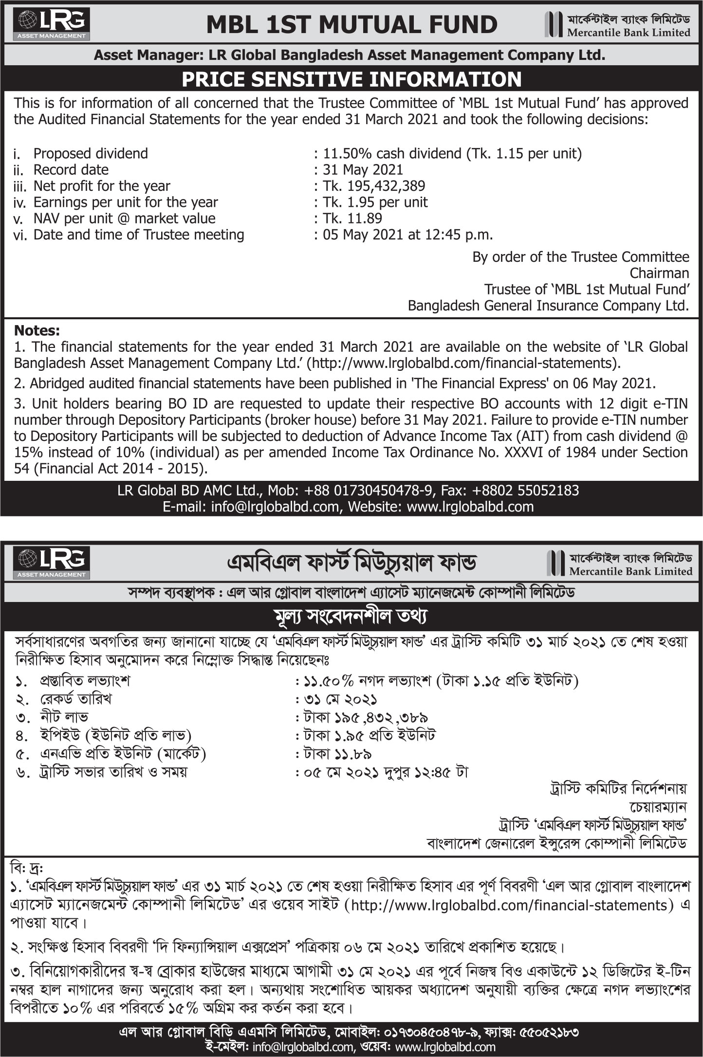 Price Sensitive Information Of MBL 1st Mutual Fund