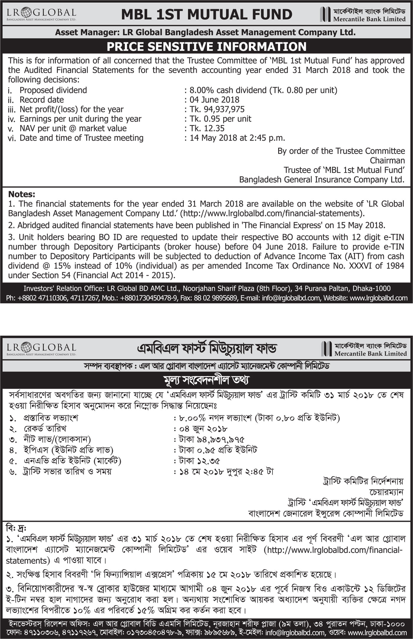 Price Sensitive Information Of MBL 1st Mutual Fund
