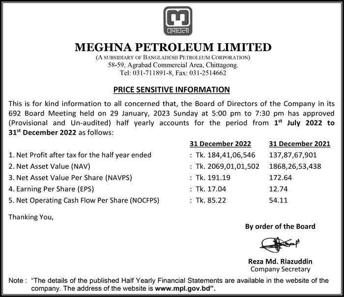 Half Yearly Financial Statements of Meghna Petroleum Limited
