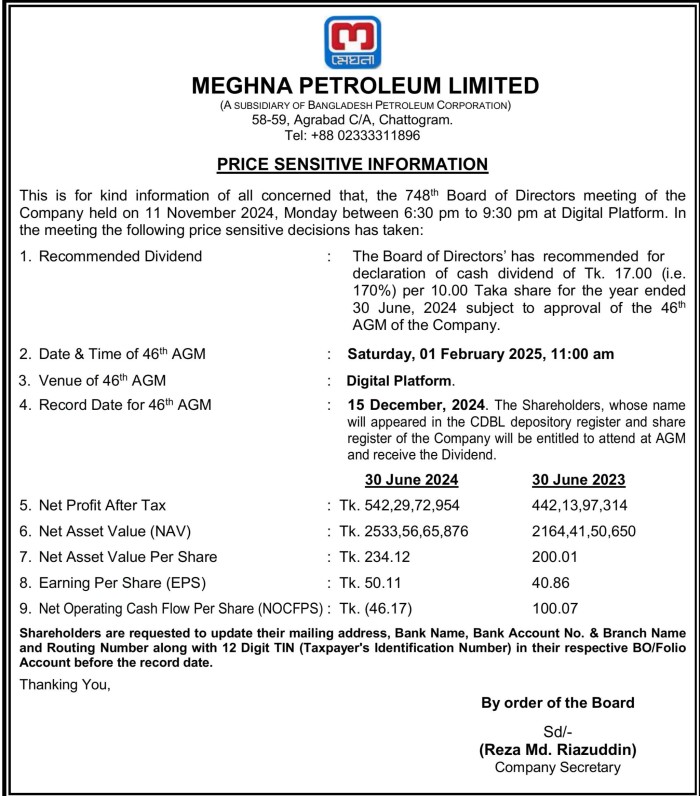 Price Sensitive Information of Meghna Petroleum Limited