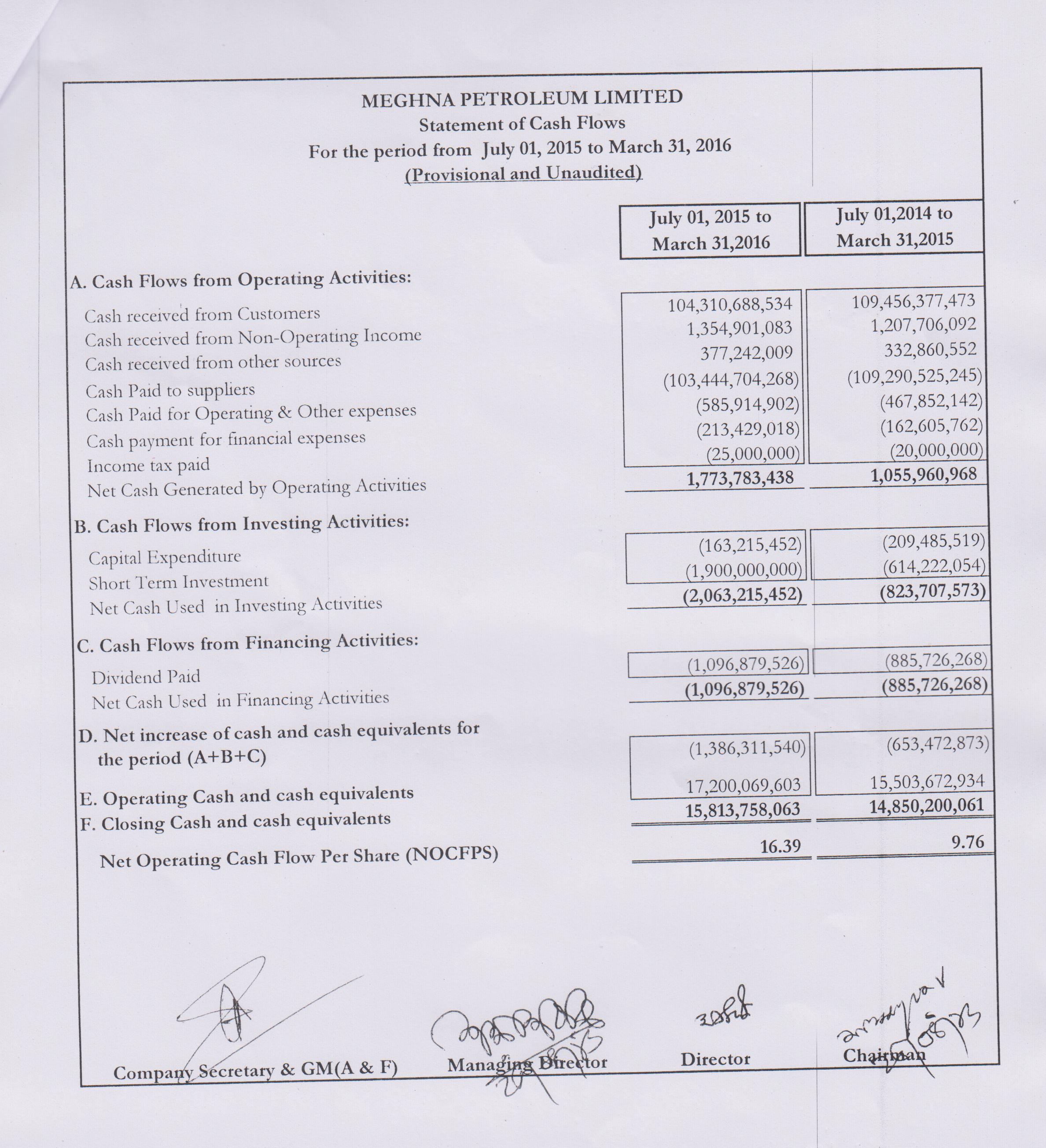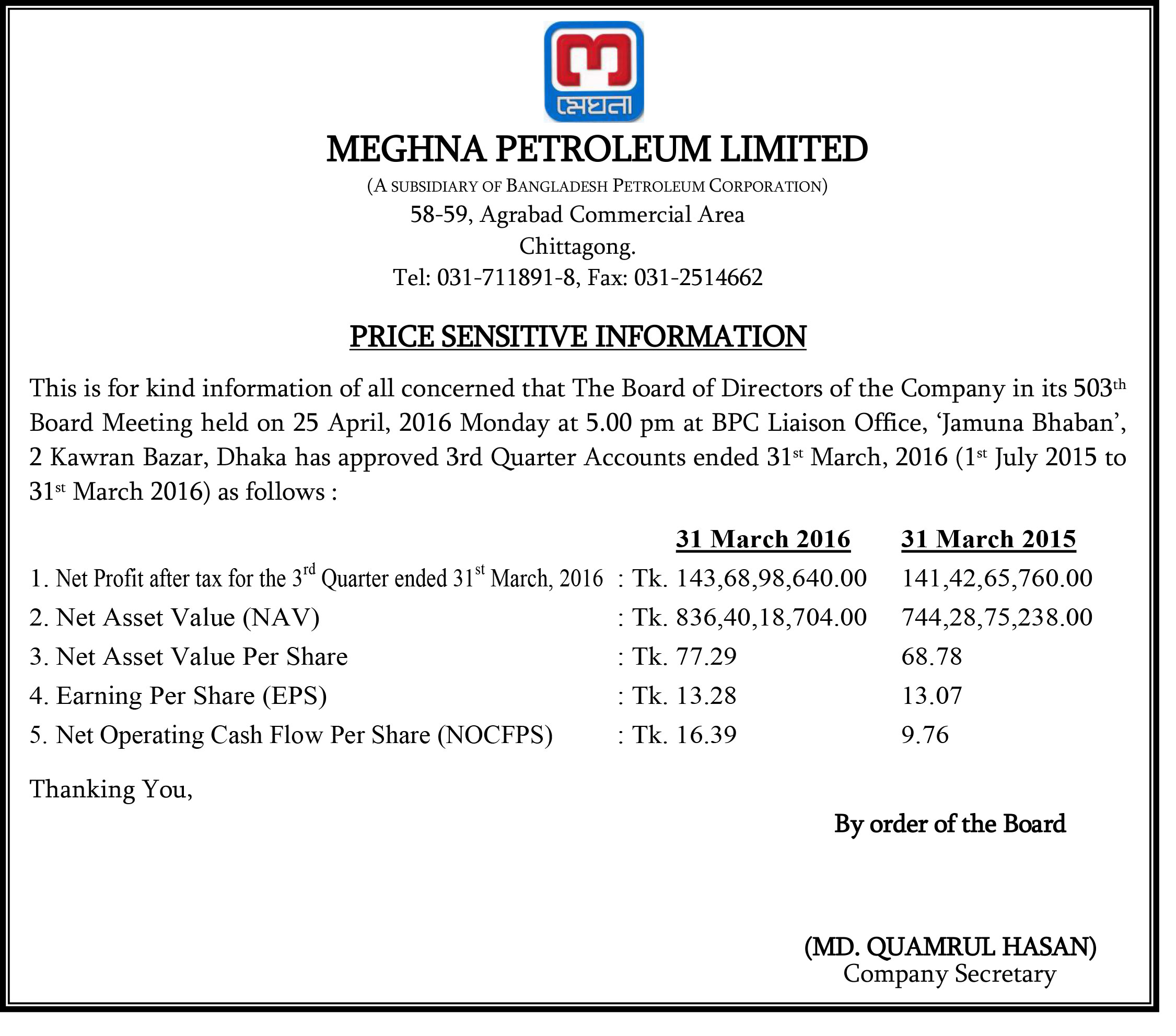 This is for kind information of all concerned that The Board of Directors of the Company in its 503th Board Meeting held on 25 April, 2016 Monday at 5.00 pm at BPC Liaison Office, ‘Jamuna Bhaban’, 2 Kawran Bazar, Dhaka has approved 3rd Quarter Accounts ended 31st March, 2016 (1st July 2015 to 31st March 2016) as follows :