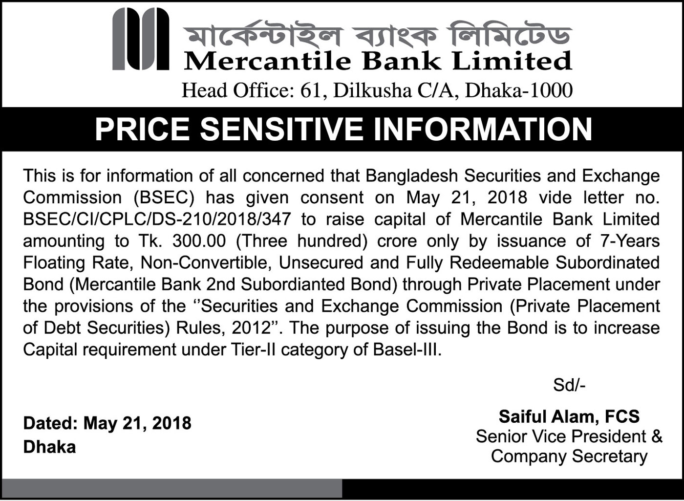 Declaration of Coupon Rate of Mercantile Bank Perpetual Bond