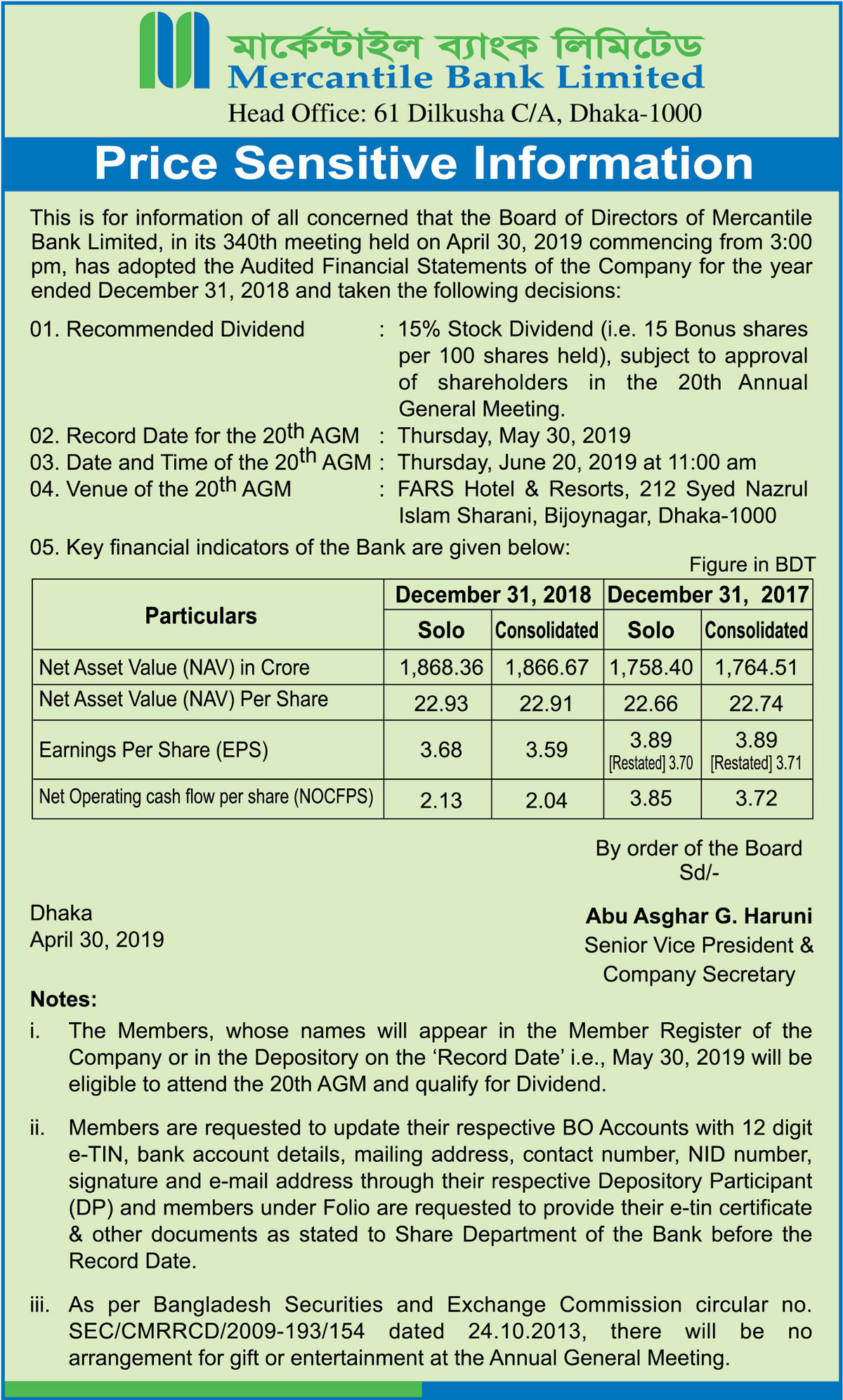 Declaration of Coupon Rate of Mercantile Bank Perpetual Bond