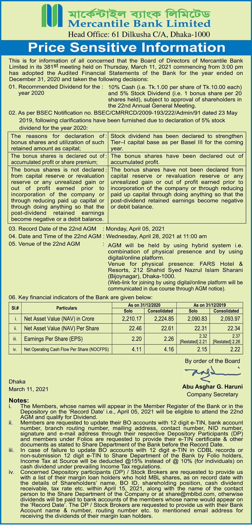 Price Sensitive Information of Mercantile Bank Limited.