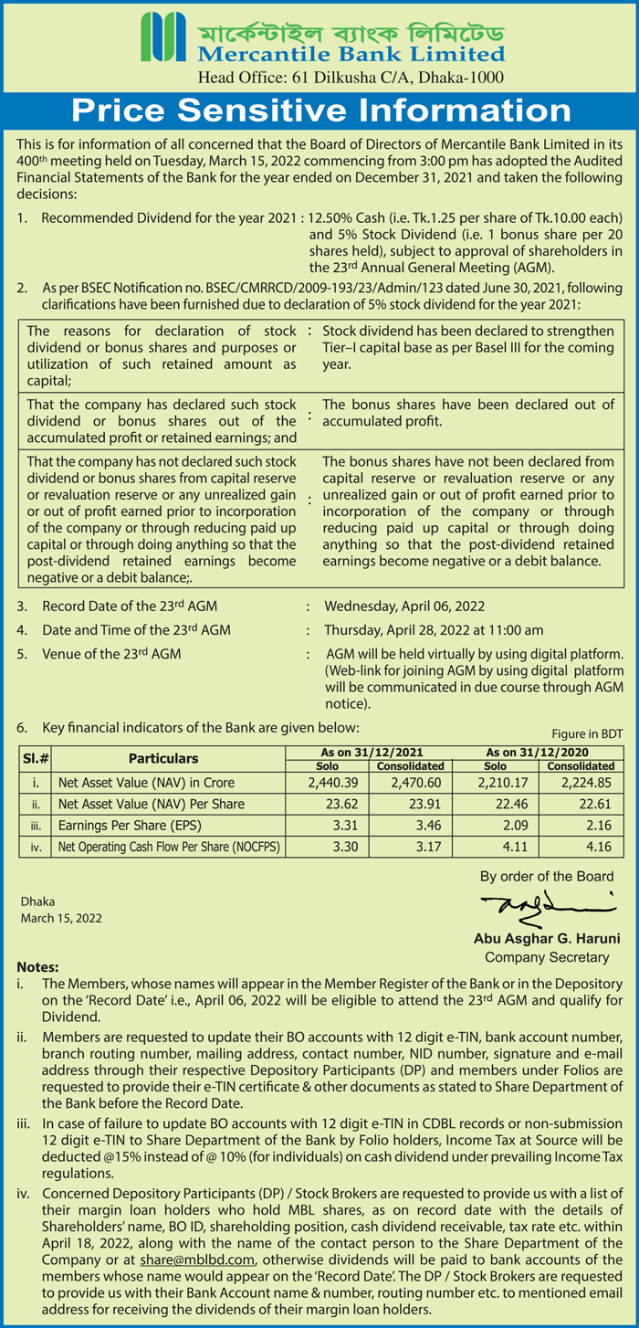 Declaration of Coupon Rate of Mercantile Bank Perpetual Bond