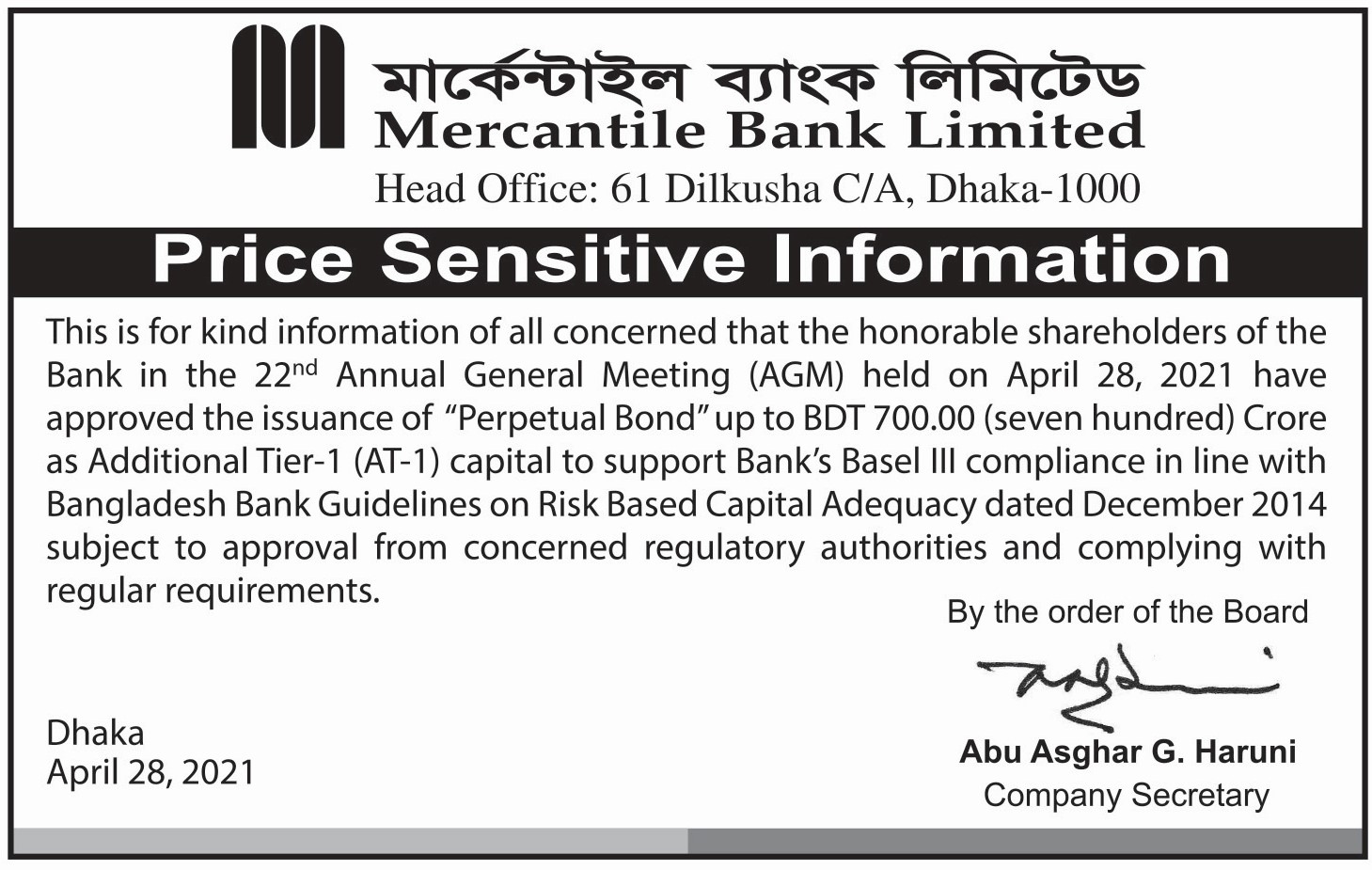 Price Sensitive Information of Mercantile Bank PLC