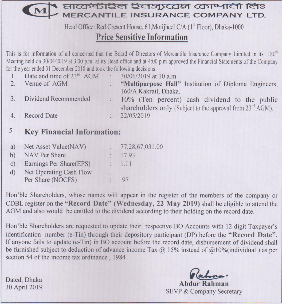 Price Sensitive Information of Mercantile Insurance Co. Ltd
