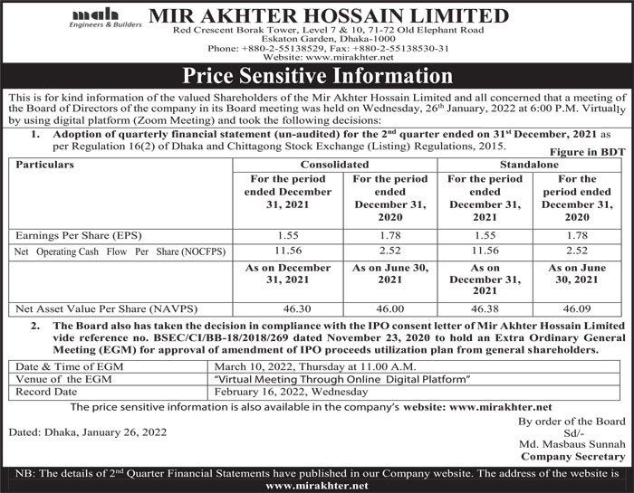 Price Sensitive Information of Mir Akhter Hossain Ltd.