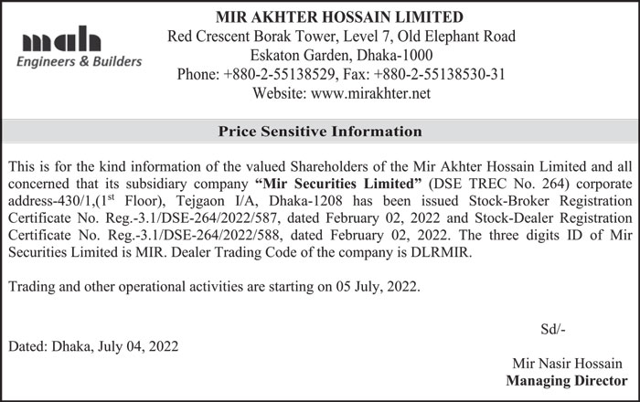 Price Sensitive Information of Mir Akhter Hossain Ltd.
