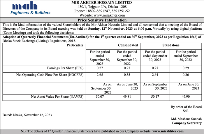 Price Sensitive Information of Mir Akhter Hossain Ltd.