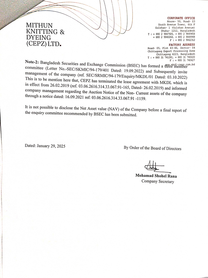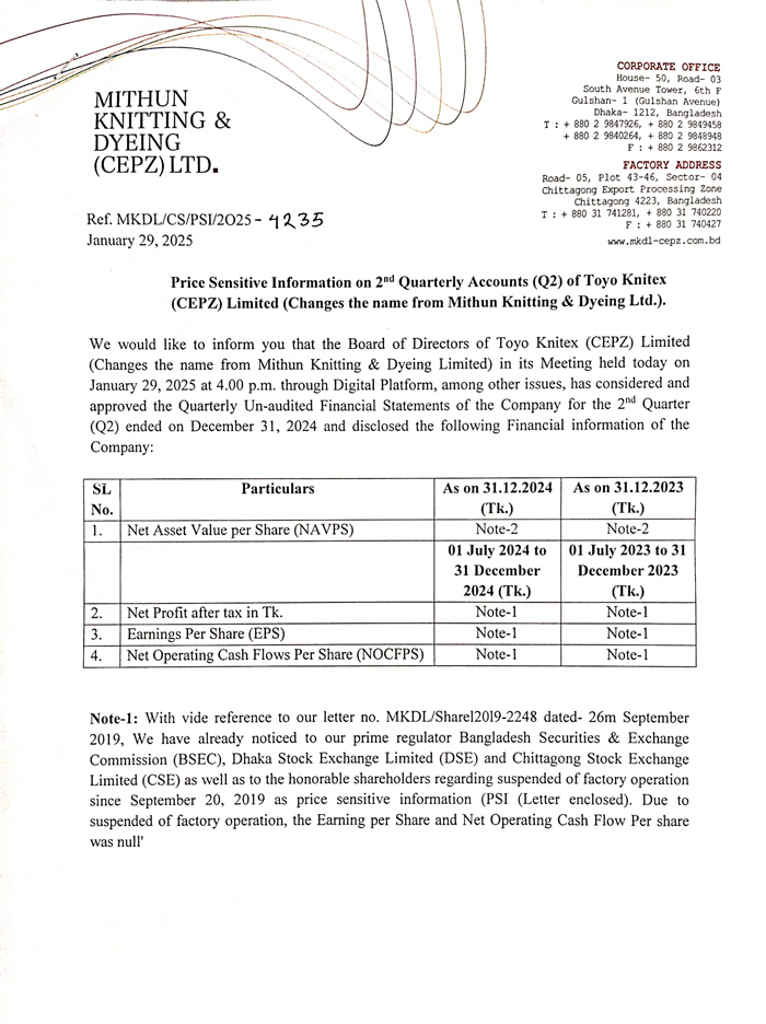 Price Sensitive Information (Q2)of Mithun Knitting And Dyeing ( CEPZ ) Ltd.