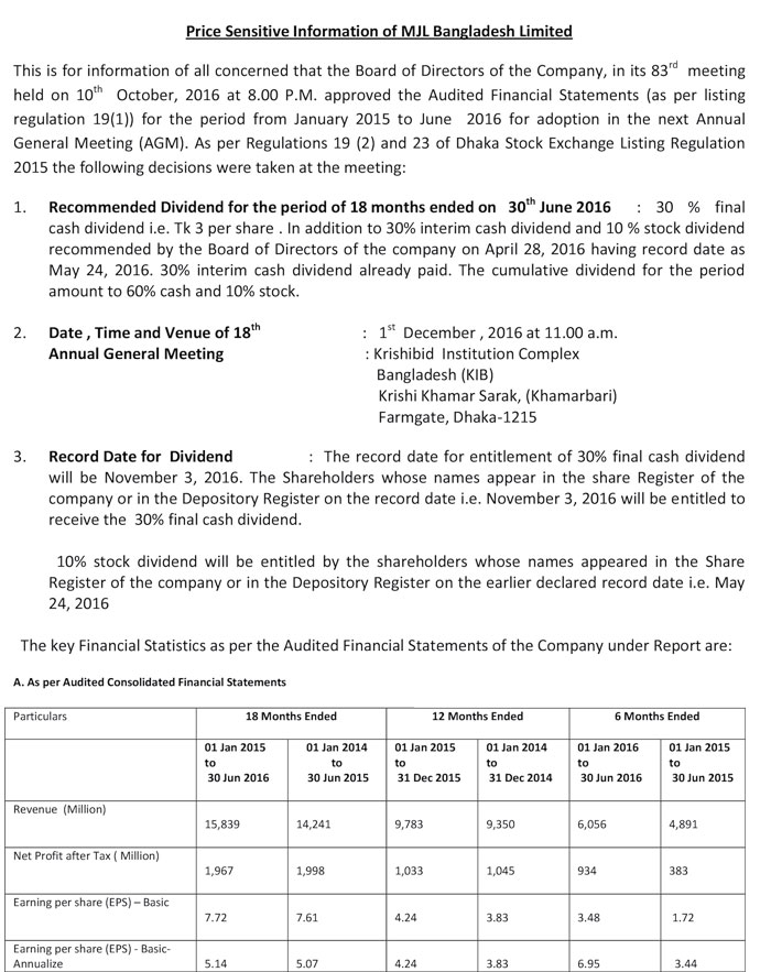 Notice to the Shareholders/Investors of MJL Bangladesh PLC
