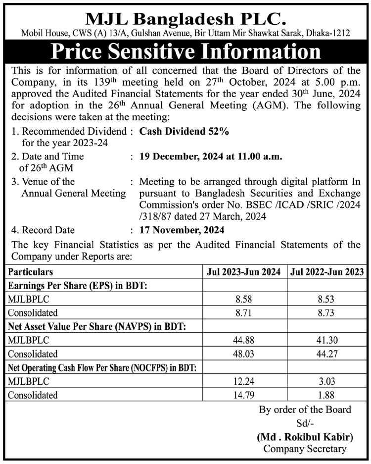 Notice to the Shareholders/Investors of MJL Bangladesh PLC