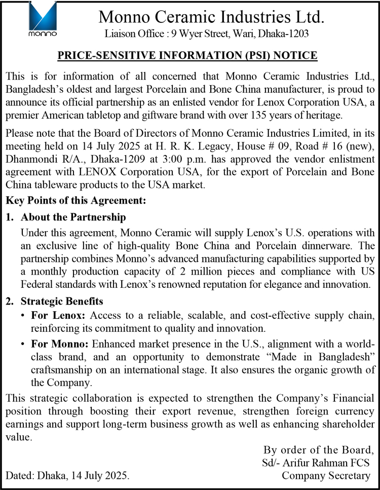 Price Sensitive Information of Monno Ceramic Industries Ltd.