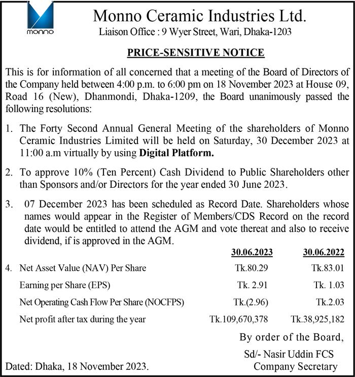 Price Sensitive Information of Monno Ceramic Industries Ltd.