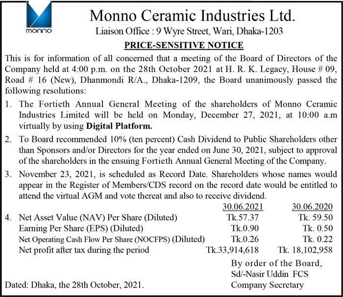 Price Sensitive Information of Monno Ceramic Industries Ltd.