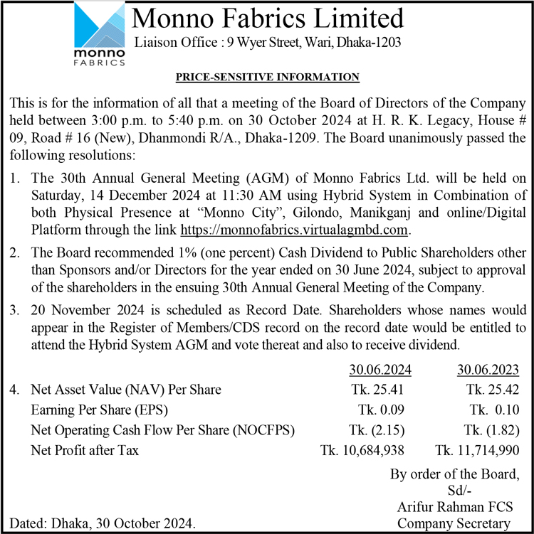 Half Yearly Financial Statement (Un-audited) of Monno Fabrics Ltd.