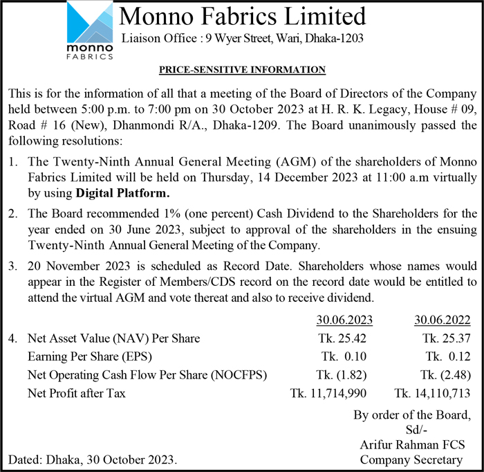 Price Sensitive Information of Monno Fabrics Limited