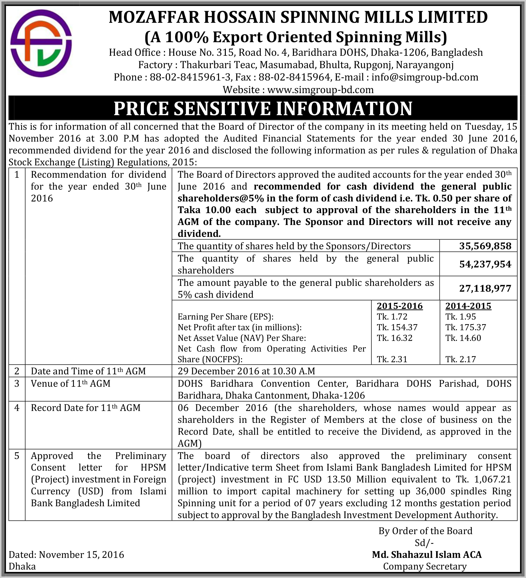 Mozaffar Hossain Spinning Mills Ltd Price Sensitive Information February 2017