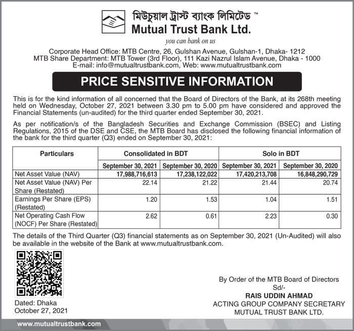 Price Sensitive Information of Mutual Trust Bank PLC.