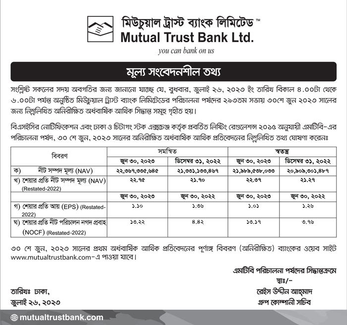 Price Sensitive Information of Mutual Trust Bank PLC.