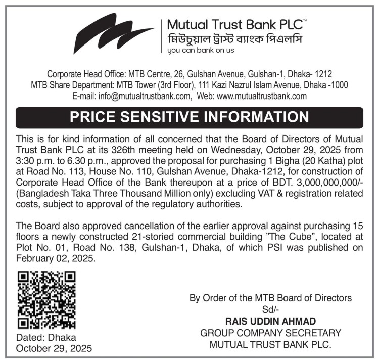 Price Sensitive Information of Mutual Trust Bank PLC.