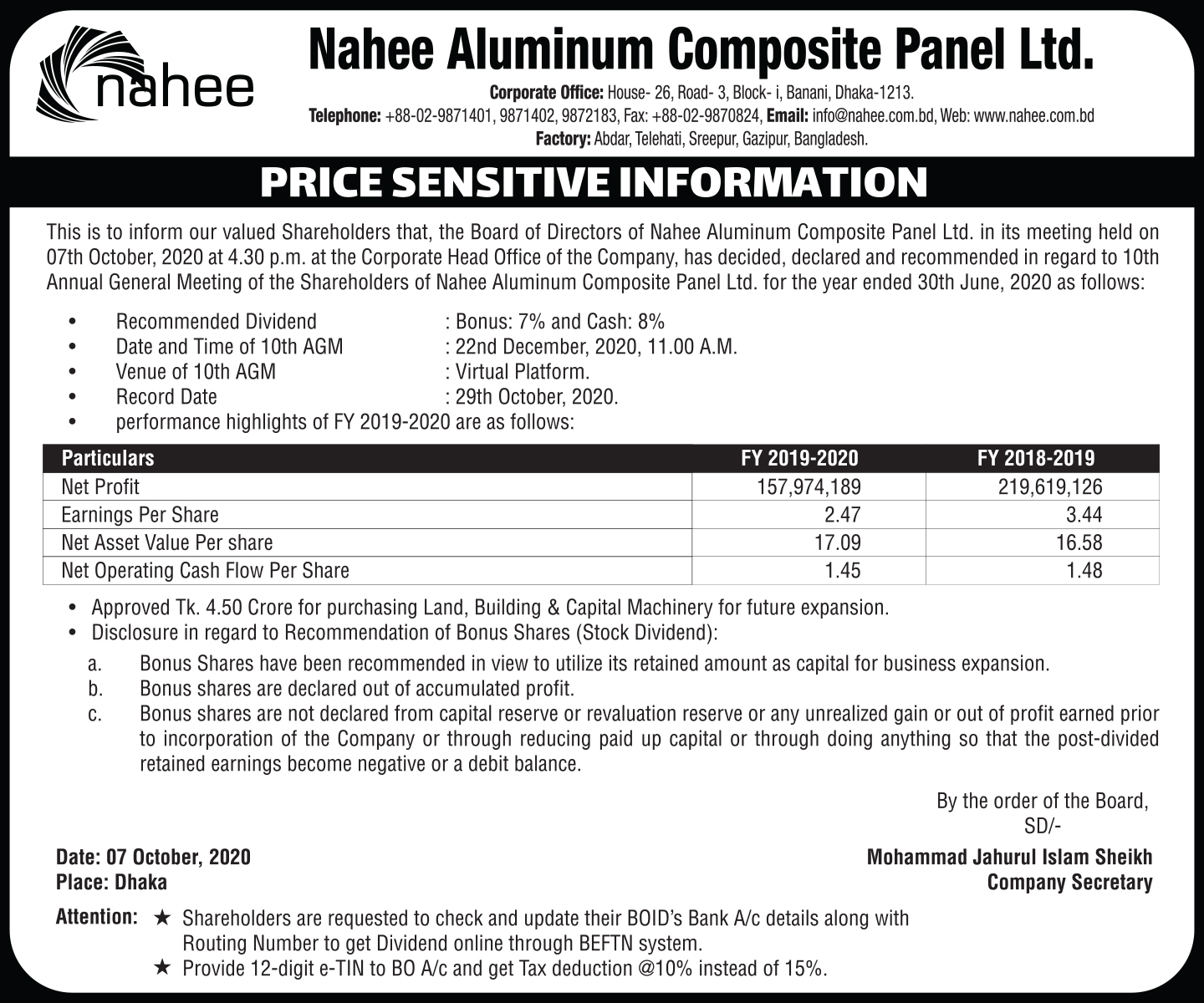 Price Sensitive Information of Nahee Aluminum Composite Panel PLC.