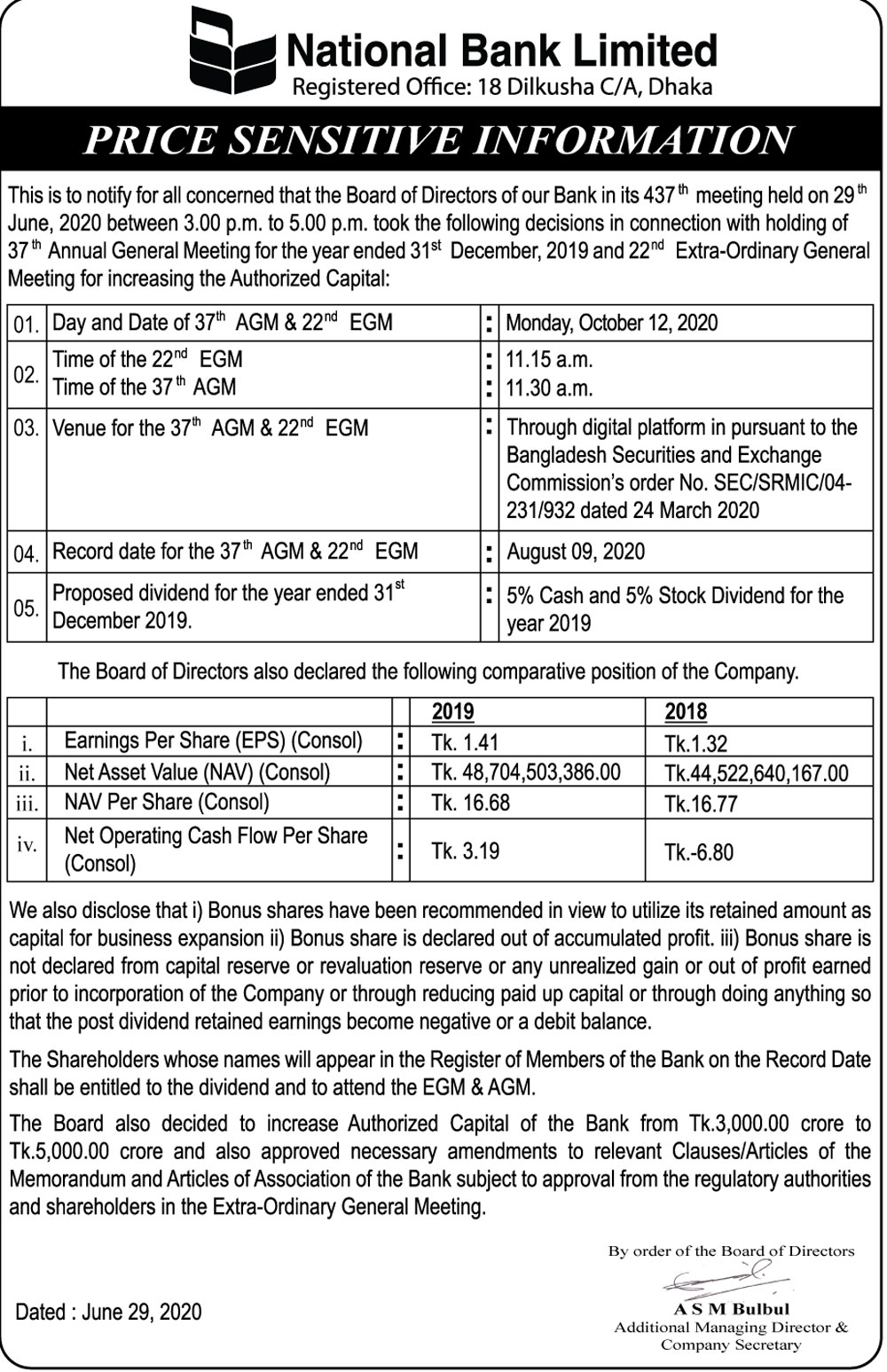 Distribution of Bonus Shares- 2018 of National Bank Limited
