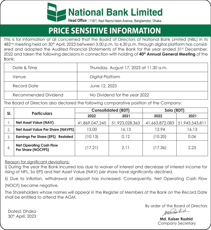 Distribution of Bonus Shares- 2018 of National Bank Limited