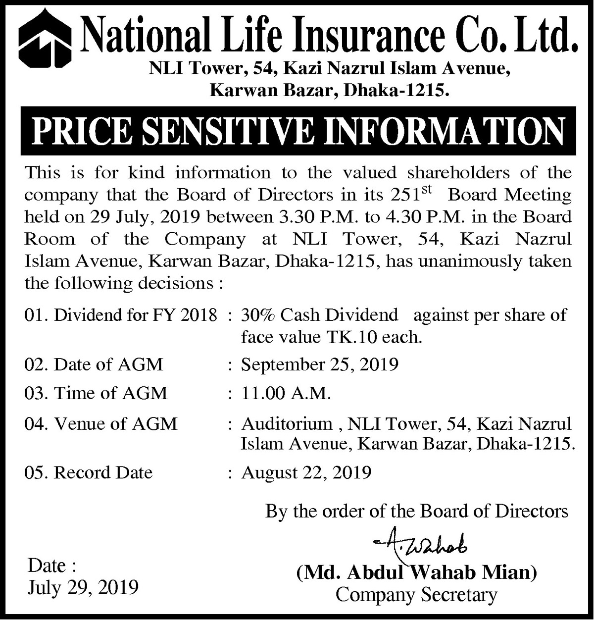 Price Sensitive Information of National Life Insurance Co. Ltd.