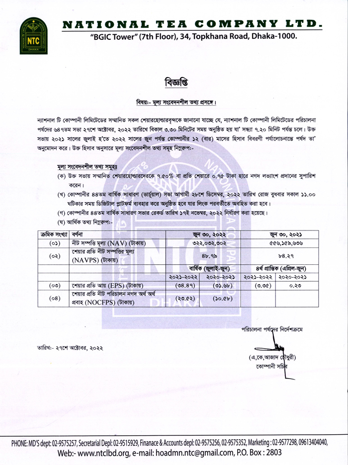 Price Sensitive Information of National Tea Company Ltd