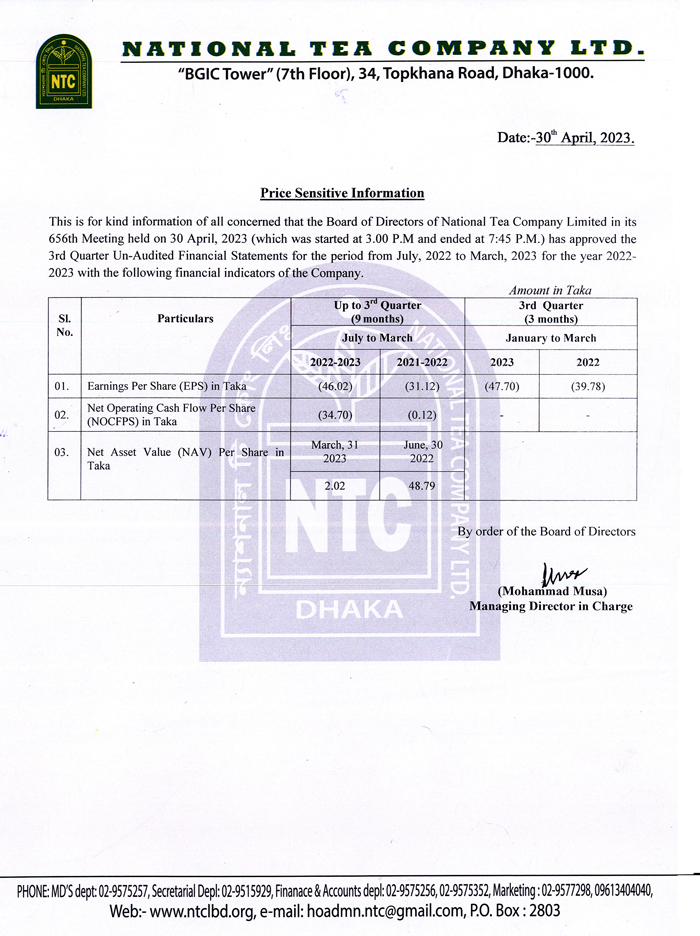 Price Sensitive Information of National Tea Company Ltd