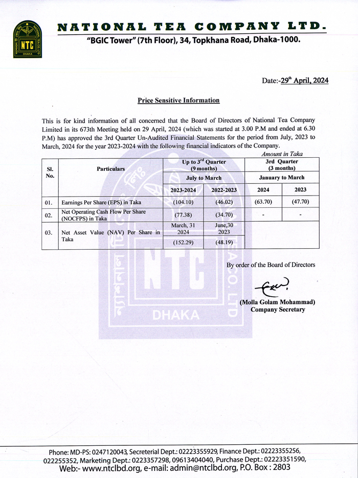 Price Sensitive Information of National Tea Company Ltd