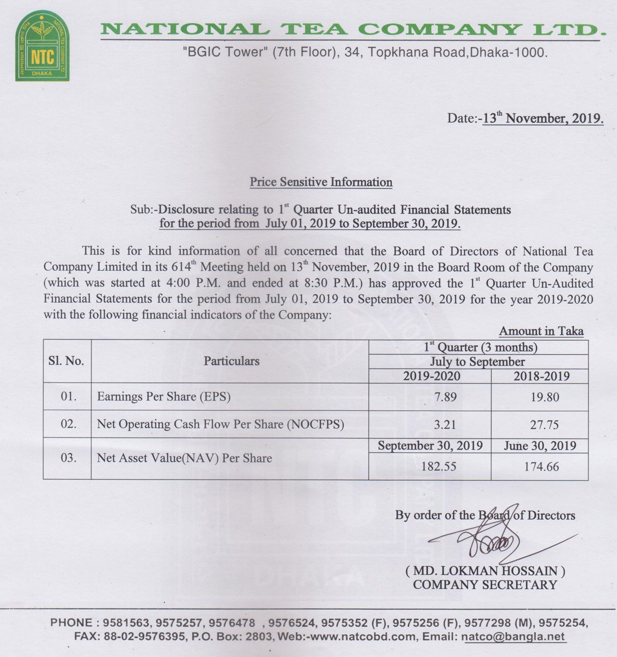 Price Sensitive Information of National Tea Company Ltd