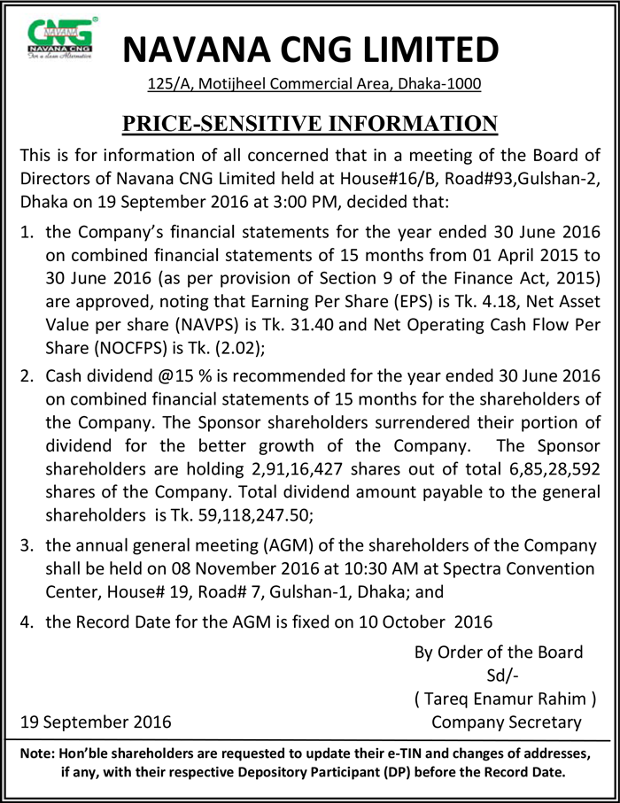 Price Sensitive Information of Navana CNG Limited